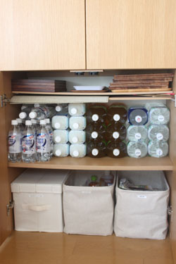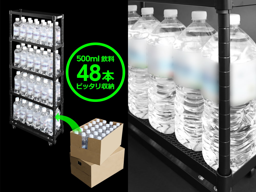 山善くらしのeショップおうち_暮らし_収納_キッチン「重たいペットボトルを」 ラクに使いこなせるワゴン収納のご紹介です。まとめ買いしたり、通販で届いたり、ストックする場所も重さも気になるペットボトル飲料。 市販のケースがすっぽり収まる容量&荷重の、山善。