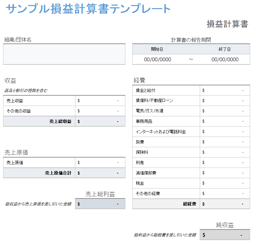 エクセルで損益計算書 テンプレート - エクセルフリー 無料ダウンロード。