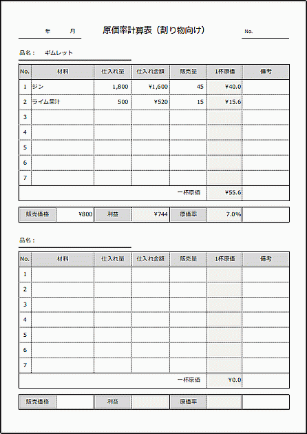 原価率計算表:単品・割り物・フード向け - テンプレートの無料ダウンロード。