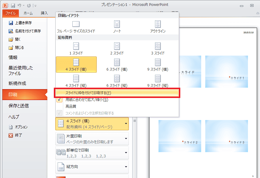 配布資料を印刷するときにスライドの枠線を出さないで印刷するOfficeヘルプの森。