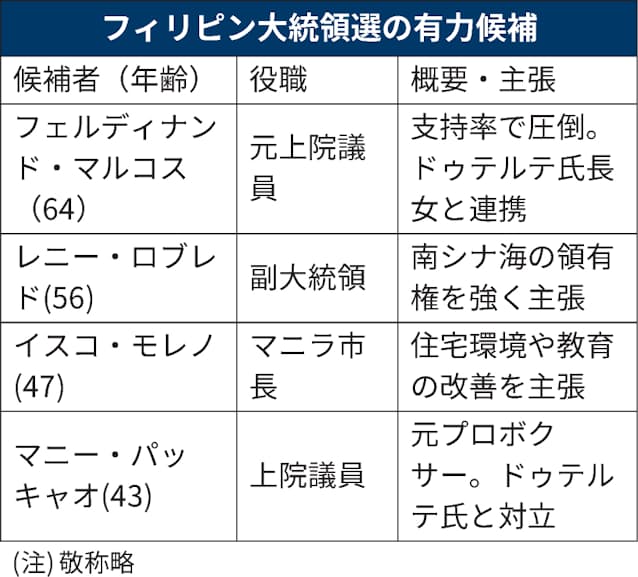 フィリピン大統領選、マルコス氏優勢続く 選挙活動解禁 - 日本経済新聞。