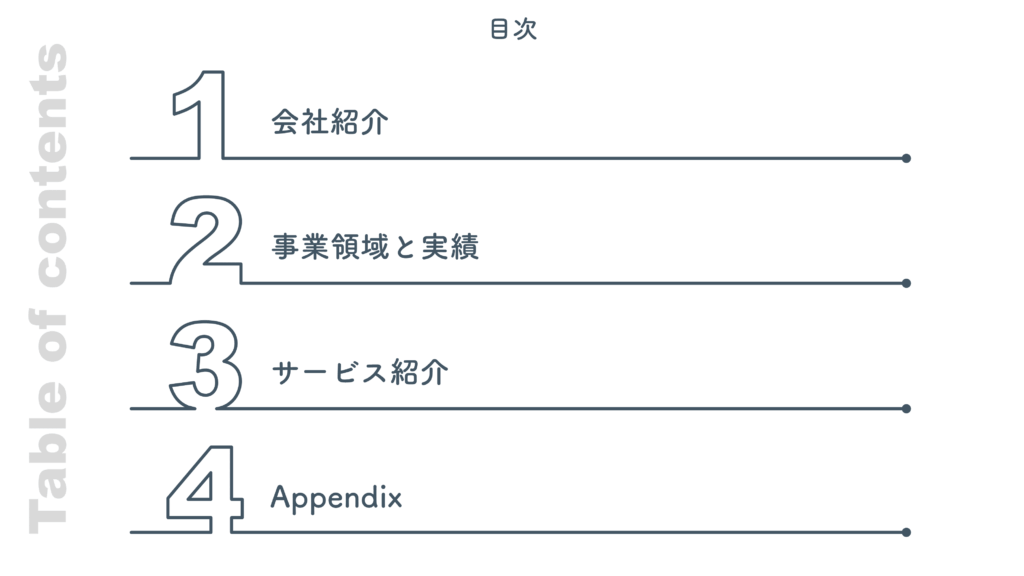 パワポ プレゼン資料の「目次」ページのデザインテンプレート16選おしゃれですぐ真似できる!ぷそらぼ。